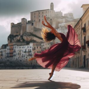Indelebile Silente Ciociara è un’opera performativa che, attraverso l’incontro del linguaggio audiovisivo e della danza, restituisce l’equilibrio precario tra coraggio e rassegnazione, fragilità e determinazione. La scelta del luogo, infatti, è ricaduta sul piccolo borgo Castro dei Volsci, situato nel cuore della Ciociaria dove si trova il monumento alla Mamma Ciociara, simbolo di lotta alla violenza di ogni genere.